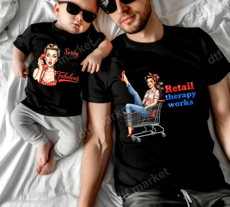 See allEmbrace your love for shopping with our vibrant 'Retail Therapy Works' DTF transfer, featuring a charming retro pin-up girl confidently lounging in a shopping cart. This design brings a playful, sassy attitude to any garment, blending vintage aesthetics with modern humor. It's a high-quality, ready to press design that’s perfect for adding a touch of personality to your wardrobe or crafting projects. This delightful design is ideal for anyone who believes a good shopping spree is the best medicine. It makes a fantastic gift for friends, sisters, or any fashion-forward woman in your life who appreciates a dose of humor and style. Perfect for birthdays, girls' night out, or simply treating yourself to a fun new look, this graphic adds a unique flair to everyday wear. Applying this heat press transfer is incredibly easy, ensuring a professional finish every time. It works beautifully on a wide range of materials including cotton, polyester, and their blends. Simply use a heat press at 300-325°F for 15 seconds with medium pressure, or apply with a household iron. No weeding or complicated setup required, making it a convenient iron on transfer for crafters and businesses alike. Our direct to film transfers boast exceptional durability and a soft, flexible feel once applied. The colors are incredibly vibrant, and the design is engineered to be crack-resistant, ensuring your shirt design looks fantastic wash after wash. Manufactured with premium DTF film and strong adhesive, this apparel transfer promises a long-lasting, high-quality addition to any fabric item.