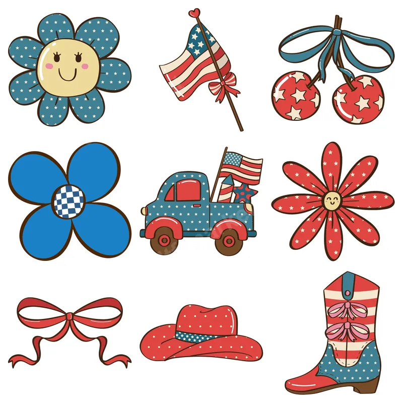 Retro 4th of July DTF Transfers: Patriotic Truck, Boot, Flag, Flowers