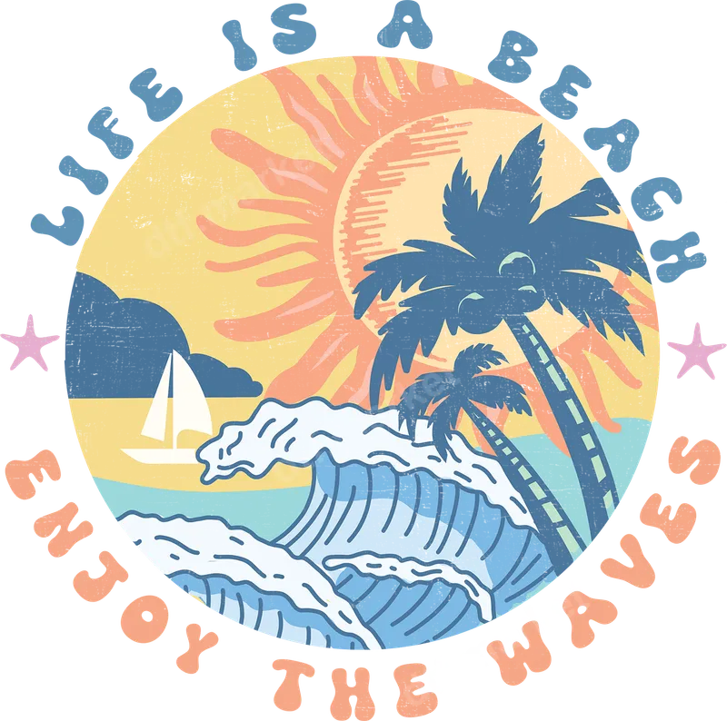 See allThis vibrant DTF transfer captures the essence of a perfect beach day with its retro, distressed aesthetic. The circular design features a brilliant sun, swaying palm trees, and dynamic ocean waves, all set against a tranquil sandy beach with a sailboat. Encircling the scene are the uplifting words "LIFE IS A BEACH ENJOY THE WAVES." This ready to press transfer brings a warm, nostalgic summer feel to any garment. This versatile design is ideal for anyone who loves the ocean, summer, and a relaxed, positive outlook. Perfect for vacation apparel, beach trips, cruise wear, or adding sunshine to your everyday wardrobe. It makes a great gift for beach lovers, surfers, travelers, or anyone needing a reminder to embrace life's waves. Create matching family vacation shirts or unique presents for friends. Applying this heat press transfer is incredibly simple. Our premium direct to film transfers work beautifully on cotton, polyester, and their blends. For best results, use a heat press at 300-325°F for 15 seconds with medium pressure, cold peel, then press again for 5 seconds. This iron on transfer requires no weeding or cutting, streamlining your customization. Experience professional quality with our durable and vibrant apparel transfers. Each heat transfer uses high-quality inks on specialized DTF film for crisp details and rich, lasting colors. Designed to be crack and fade-resistant, they're incredibly soft to the touch. The strong adhesive guarantees your design stays put, washable without losing integrity.