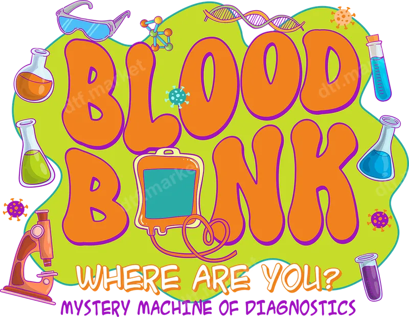 See allThis DTF transfer features bold, groovy orange "BLOOD BANK" text on a vibrant lime green background, reminiscent of classic retro cartoons. Playful scientific elements like beakers, test tubes, DNA strands, and a microscope create a fun, laboratory-themed aesthetic. The phrase "WHERE ARE YOU? MYSTERY MACHINE OF DIAGNOSTICS" playfully hints at beloved vintage pop culture, making this ready to press design a unique and humorous blend of science and nostalgia. This eye-catching heat transfer is ideal for medical professionals, lab technicians, scientists, phlebotomists, or anyone in healthcare who appreciates humor. It's also perfect for biology or medicine students, or fans of retro cartoons and quirky designs. Use this apparel transfer to create a standout gift for a colleague's birthday, a graduation, or to add personality to your wardrobe for casual wear or themed parties. Our direct to film transfers are incredibly versatile, adhering flawlessly to cotton, polyester, and various blends. Applying your new iron on decal is simple: use a heat press at 300-325°F for 15 seconds with medium pressure, or follow instructions for a household iron. Enjoy professional results without the hassle of weeding, cutting, or layering, making your customization project quick and easy. Experience exceptional quality with our premium DTF film transfers. Each design boasts vibrant, crack-resistant colors and a remarkably soft-to-the-touch finish that feels great on any garment. Our professional-grade DTF transfers feature a strong adhesive, ensuring your custom transfer will last through countless washes, maintaining its vivid appearance and integrity.