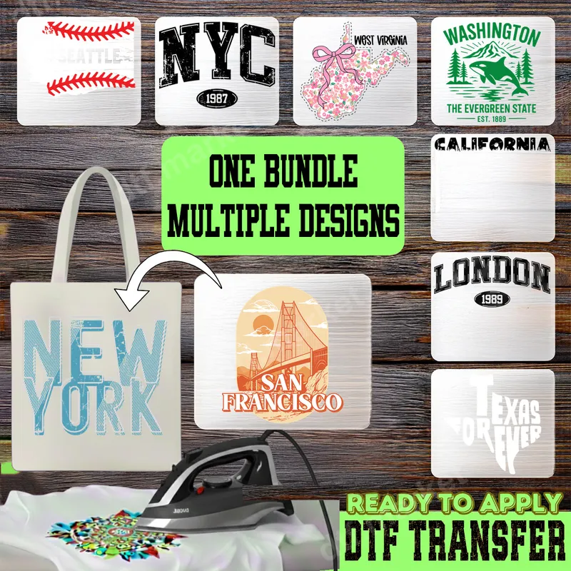See allDiscover our exclusive Retro City & State DTF Transfer Bundle, a vibrant collection of designs celebrating popular destinations across the globe. Each design in this bundle is a high-quality DTF transfer, meticulously crafted with a unique vintage or graphic style, making them ready to press onto your favorite apparel. From the classic distressed 'NYC 1987' to the scenic 'San Francisco' Golden Gate Bridge, this bundle offers diverse artistic expressions for every city or state enthusiast. This versatile collection is perfect for travelers wanting to commemorate their adventures, proud locals showcasing their hometown spirit, or anyone looking for a unique gift. Whether you're designing custom t-shirts for a family vacation, creating personalized hoodies for friends, or making unique tote bags, these designs cater to a wide audience. They’re ideal for birthdays, travel souvenirs, or simply adding a touch of personalized flair to your everyday wardrobe. Applying these heat press transfers is a breeze! They work beautifully on a wide range of fabrics including cotton, polyester, and various blends. For best results, use a heat press at 300-325°F for 15 seconds with medium pressure, then cold peel. You can also achieve great results with a household iron, making them truly iron on transfers accessible to everyone. Forget tedious weeding; these heat press ready designs save you time and effort. Our DTF transfers are renowned for their exceptional quality. Experience incredibly vibrant colors, superior stretch, and a crack-resistant finish that endures wash after wash. The professional DTF film ensures a soft feel on the fabric, providing comfort without compromising durability. Elevate your apparel with these premium, long-lasting shirt designs that truly stand out.