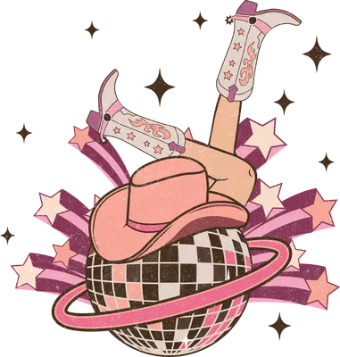 See allThis vibrant DTF transfer captures the ultimate retro disco cowgirl aesthetic with kicking legs adorned in stylish pink cowboy boots, a chic matching cowboy hat, and a shimmering disco ball. Surrounded by playful shooting stars and glittery accents, this ready to press design seamlessly blends classic western charm with a groovy vintage vibe, perfect for making a bold fashion statement. The distressed texture adds an authentic, worn-in feel to this unique graphic.