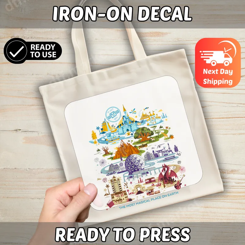 See allThis DTF transfer features a vibrant, detailed collage of famous theme park landmarks, capturing the essence of a beloved magical destination. With a charming, illustrated style, it celebrates "The Most Magical Place on Earth" and nods to its opening with "01 OCT 1971." This high-quality DTF transfer is designed to bring that nostalgic park magic to life on any garment, offering a pre-printed and prepared, ready to press transfer for immediate application. This iconic heat press design is perfect for Disney enthusiasts, families planning a magical vacation, or anyone who cherishes memories of theme park adventures. It makes an ideal gift for birthdays, anniversaries, or as a special souvenir. Use it to create matching shirts for a family trip, custom tote bags for park essentials, or unique apparel that showcases your love for the most enchanting place on earth. Applying this versatile iron on transfer is simple and efficient. It adheres beautifully to a wide range of fabrics, including cotton, polyester, and various blends, making it perfect for almost any garment. For best results, use a heat press at 300-325°F for 15 seconds with medium pressure. A household iron can also be used with firm, even pressure. Enjoy the convenience of a ready-to-use design with no tedious weeding required. Experience professional-grade results with this durable t-shirt transfer. Our DTF transfers are known for their vibrant colors that resist cracking and fading, ensuring your custom apparel looks great wash after wash. The design boasts a soft, lightweight feel once applied, seamlessly integrating with the fabric. Each transfer is produced using professional DTF film and strong adhesive, guaranteeing a long-lasting, high-quality finish.