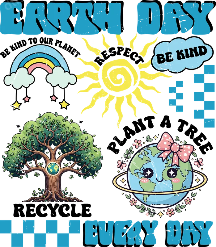 See allThis vibrant DTF transfer captures the spirit of environmental awareness with a charming retro aesthetic. It features distressed "EARTH DAY EVERY DAY" lettering, complemented by playful graphics like a rainbow, a shining sun, a lush tree embodying the planet, and an adorable kawaii Earth. Uplifting messages such as "BE KIND TO OUR PLANET," "RESPECT," "PLANT A TREE," and "RECYCLE" are woven throughout, making this a powerful and positive statement piece. This ready to press design is perfect for anyone passionate about protecting our world. This unique iron on transfer is ideal for environmental enthusiasts, educators, students, and families looking to spread a message of planetary care. It's perfect for Earth Day celebrations, school projects, nature group events, or simply as an everyday reminder to live consciously. This versatile heat press design also makes a thoughtful and inspiring gift for friends and loved ones who share a passion for sustainability and kindness towards our natural world. Applying this apparel transfer is quick and effortless. Our premium DTF transfers are designed to adhere beautifully to a wide range of fabrics, including cotton, polyester, and various blends. For best results, use a heat press at 300-325°F for 15 seconds with medium, firm pressure. While a heat press is recommended, you can also achieve great results with a household iron (ensure even, firm pressure). Forget tedious weeding; this heat press ready design arrives completely finished, saving you time and effort. Experience exceptional quality with our direct to film transfers. Each design boasts vibrant, true-to-life colors that resist cracking and fading, ensuring your garment looks fantastic wear after wear. The finished product offers a soft, lightweight feel, integrating seamlessly with the fabric. Crafted using professional-grade DTF film and strong adhesive, this t-shirt transfer is built for durability and a high-quality finish, providing a professional look every time.