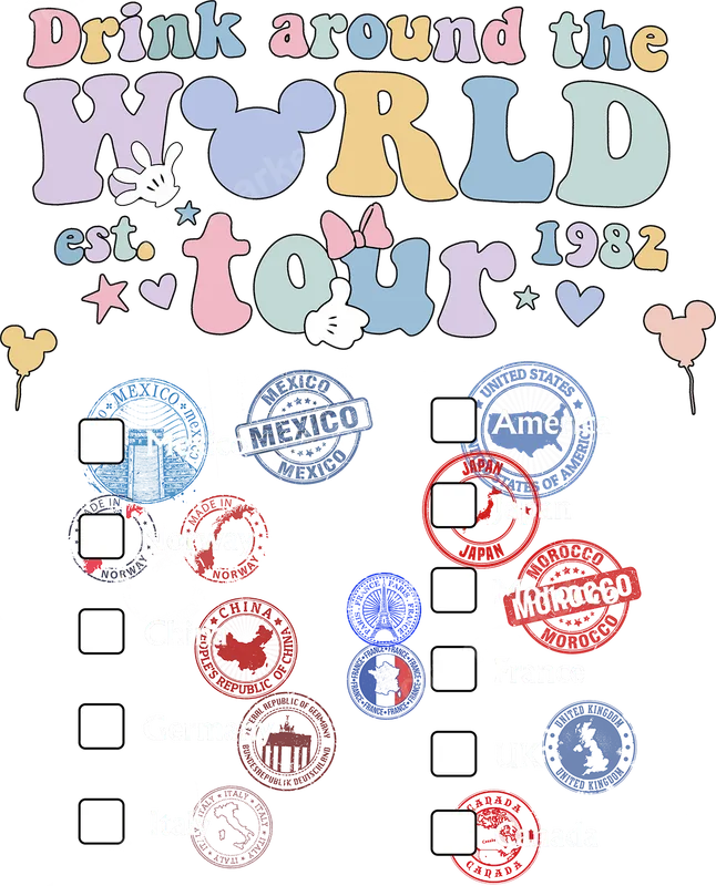 See allEmbrace the nostalgic charm of a classic Epcot adventure with this vibrant 'Drink around the WORLD est. 1982 tour' DTF transfer. Featuring playful pastel fonts, iconic mouse hands and bows, and a collection of passport-style country stamps like Mexico, Japan, France, and Canada with checkboxes, this design perfectly captures the spirit of international fun. This ready to press design is ideal for creating unique apparel for your next group trip or themed party. This whimsical heat press design is perfect for Epcot enthusiasts, Disney adults, bachelorette parties, or girls' trip groups looking to commemorate their international drinking quests. It makes an unforgettable gift for birthdays, vacations, or any special occasion celebrating friendship and fun. Get ready to turn heads and spark conversations with this delightful apparel transfer. Applying this DTF heat transfer is incredibly easy. It works seamlessly on a wide range of fabrics, including cotton, polyester, and various blends, making it versatile for any garment. Simply apply with a heat press at 300-325°F for 15 seconds with medium pressure, then peel the film warm or cool. You can even use a household iron for smaller applications. Best of all, there's absolutely no weeding required, saving you time and effort. Our professional-grade DTF transfer boasts brilliant, lasting colors that resist cracking and fading, ensuring your garment looks fantastic wear after wear. The transfer feels soft to the touch, not stiff or bulky, and features a strong adhesive for reliable, long-lasting adherence. Elevate your wardrobe with this high-quality t-shirt transfer, designed for durability and a flawless finish.