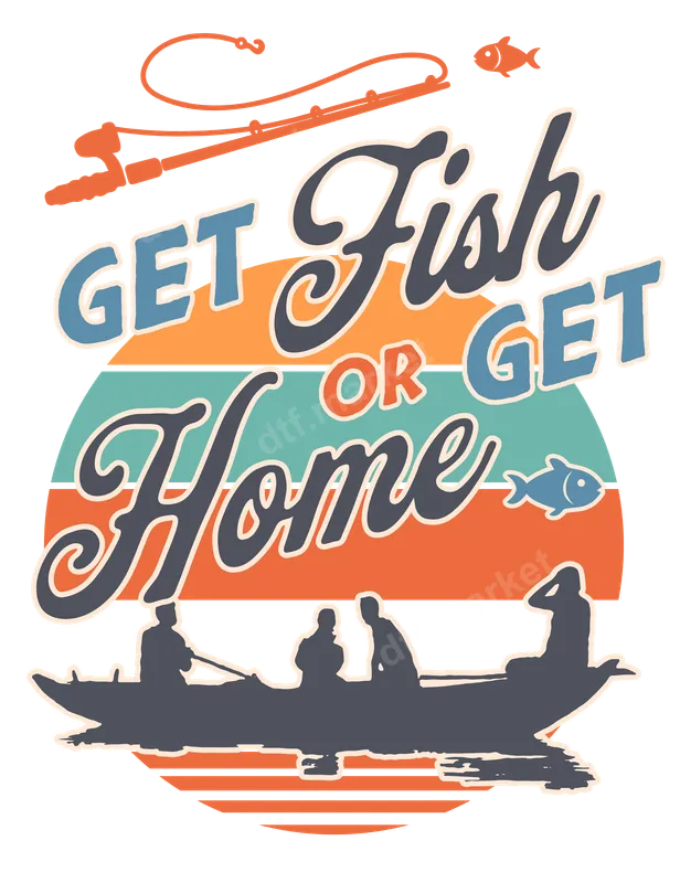 See allThis vibrant retro-style DTF transfer captures the spirit of a perfect day out on the water. Featuring the humorous and determined slogan "GET Fish OR GET Home" in a cool mix of vintage fonts, the design showcases a classic fishing rod, playful fish, and a serene silhouette of three individuals in a boat against a beautiful striped sunset backdrop. This premium ready to press transfer is ideal for anyone who lives for the tranquility and thrill of fishing. This unique heat transfer is perfect for the avid angler, outdoor adventurer, or anyone who loves a good laugh and the great outdoors. It makes an excellent gift for Father's Day, birthdays, or as a fun addition to custom apparel for fishing trips, lake house gatherings, or casual everyday wear. Surprise your dad, grandpa, friend, or fishing buddy with a design that truly speaks to their passion. Applying this heat press transfer is a breeze on a variety of fabrics including cotton, polyester, and blends. For best results, use a heat press at 300-325°F for 15 seconds with medium pressure, then cold peel. For smaller projects or home use, a household iron can also be utilized (ensure even, firm pressure). There's no tedious weeding required, making this an easy and efficient iron on transfer solution for creating professional-looking garments in minutes. Our direct to film transfer boasts exceptional quality, offering vivid colors that pop and a soft, flexible feel that won't crack or fade after washing. Each apparel transfer is made with professional-grade DTF film and a strong adhesive, ensuring your custom t-shirt transfer withstands the test of time and countless adventures. Get your heat press ready and transform any garment into a statement piece.