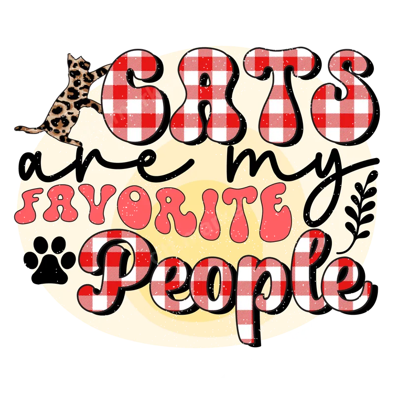 See allThis charming DTF transfer features "CATS are my FAVORITE People" in a delightful retro style. The bold "CATS" and "People" text boasts a classic red and white gingham pattern, complemented by a cute leopard-print cat, paw print, and leafy sprig. The distressed cream background adds a vintage touch, making this design a truly unique and ready to press statement piece for any cat enthusiast. This design is ideal for devoted cat parents, feline fanatics, and anyone who appreciates quirky, retro charm. It's a fantastic gift idea for birthdays, Mother's Day, holidays, or just because, for your favorite cat mom or dad. Perfect for creating custom apparel for casual outings, pet adoption events, or simply lounging at home with your beloved furry companions. Our premium direct to film transfer technology makes applying this design a breeze. This heat press ready iron on transfer works flawlessly on a wide variety of fabrics, including cotton, polyester, and cotton/poly blends. For best results, use a heat press at 300-325°F for 15 seconds with medium pressure. Even household irons can achieve great results, making this an accessible way to personalize your wardrobe. Experience superior quality with our vibrant, crack-resistant t-shirt transfer. Each DTF transfer is printed with professional-grade inks on high-quality film, ensuring vivid colors and sharp details that last wash after wash. The strong adhesive provides excellent durability, while the soft-to-the-touch finish keeps your apparel comfortable. Elevate your custom garment collection with this exceptional apparel transfer.