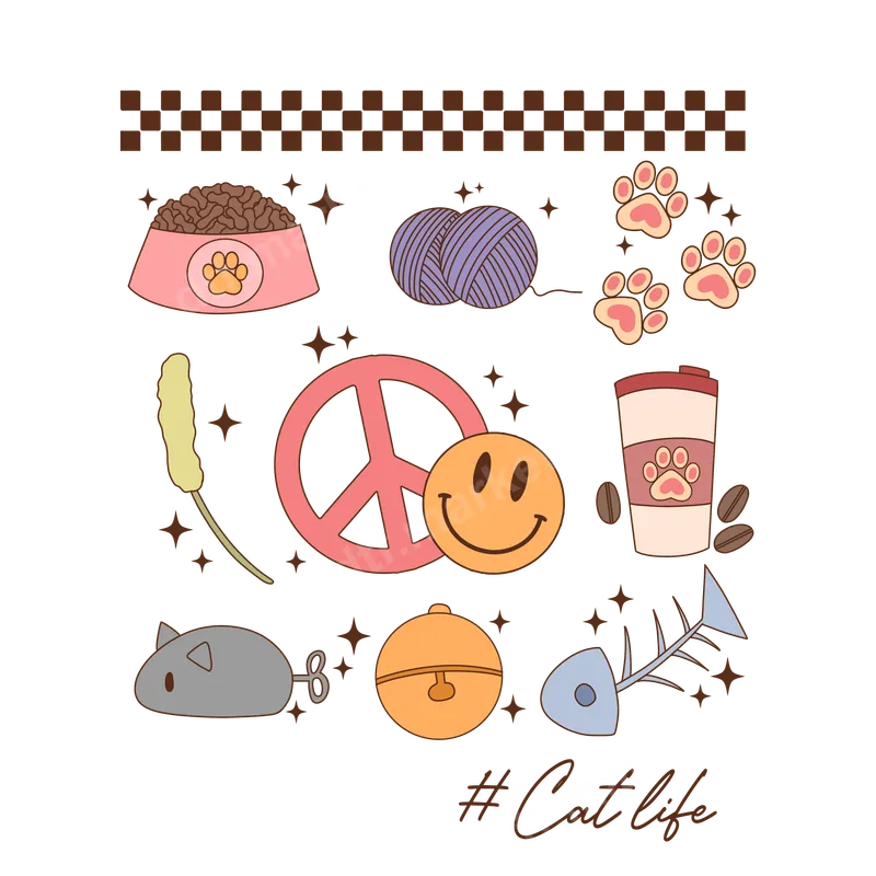 See allThis vibrant retro cat life DTF transfer brings a playful, groovy vibe. It features charming feline-themed elements like a cat food bowl, yarn, paw prints, and a fish skeleton, alongside feel-good symbols such as a peace sign and a smiley face, all framed by a checkerboard border. The "# Cat life" script ties it together, making this a unique and ready to press transfer for your next custom project. Perfect for devoted cat moms, cool cat dads, and anyone who adores their furry friends with a side of retro flair. This eye-catching iron on transfer is an ideal gift for birthdays, Mother's Day, or simply to celebrate pet ownership. Create custom apparel for casual outings, cat rescue events, or just lounging at home, expressing your love for cats in a stylish, nostalgic way. Applying this high-quality heat press design is simple and quick, suitable for both seasoned crafters and beginners. It works beautifully on cotton, polyester, and various fabric blends. For optimal results, use a heat press at 300-325°F for 15 seconds with medium pressure, followed by a warm or cool peel. No tedious weeding is required, saving you time on your personalized t-shirt transfer projects, ensuring a professional finish. Our direct to film transfers use premium DTF film and inks, guaranteeing vivid colors and exceptional durability. The result is a soft-to-the-touch print that resists cracking and fading, keeping your custom garments looking great wash after wash. The strong adhesive ensures a lasting bond, making this ready to press transfer a reliable choice for long-term wear. Experience professional-grade results that stand out.