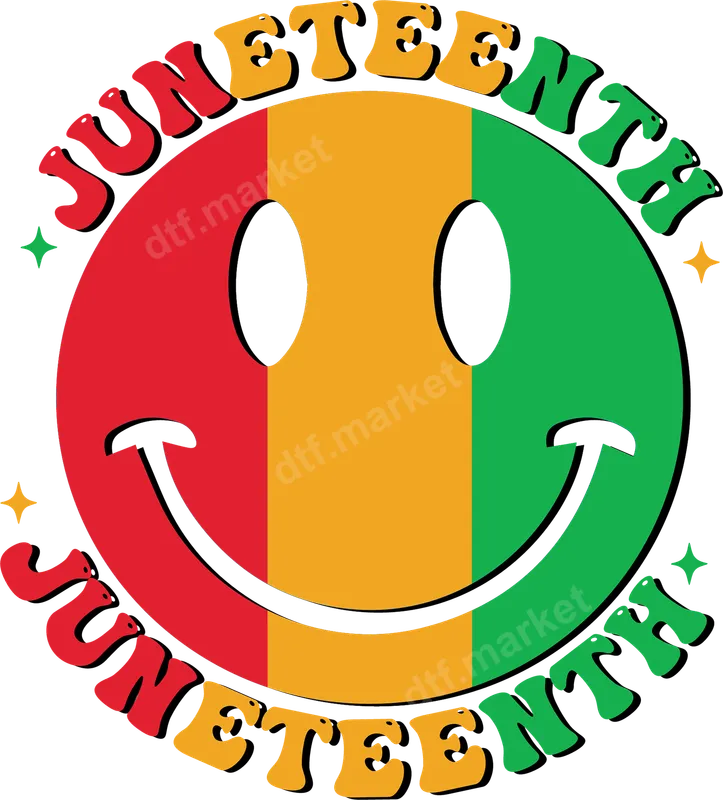 See allThis vibrant DTF transfer showcases a cheerful retro smiley face, boldly colored with the Pan-African flag's red, gold, and green stripes. The word "JUNETEENTH" curves around the top and bottom in a playful, bubbly font, accented with sparkling stars. This eye-catching design exudes a celebratory and nostalgic vibe, making it a fantastic ready to press graphic for commemorating this significant day and showing pride with vintage flair. This design is ideal for anyone celebrating Juneteenth, perfect for community events, family gatherings, parades, and educational initiatives. Crafters, small businesses, and individuals can use this heat transfer to create custom apparel. It also makes an empowering gift for activists, educators, and those who cherish freedom and history. Applying this versatile iron on transfer is simple. It adheres beautifully to cotton, polyester, and blends. Use a heat press at 300-325°F for 15 seconds with medium pressure for a cool peel. A household iron can also be used. There's no weeding, cutting, or layering required – just press and go! This heat press ready design offers hassle-free customization. Our direct to film transfers are crafted using premium quality materials, ensuring your finished product is exceptionally vibrant, soft to the touch, and built to last. Advanced printing technology guarantees excellent color retention and crack resistance after multiple washes. Each shirt design is printed on professional-grade DTF film with strong adhesive, providing a durable and flexible finish for your garment.