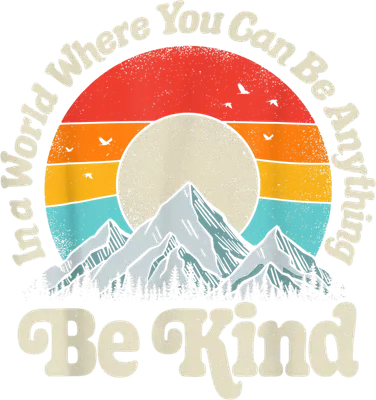 Embrace positivity with this vibrant retro-style DTF transfer, featuring a stunning mountain landscape at sunset or sunrise. The design showcases detailed peaks, a forest of pine trees, and birds soaring against a distressed, gradient sky of warm reds, oranges, and cool blues, all centered around a soft, glowing sun. Arched gracefully above the scene, the timeless message "In a World Where You Can Be Anything" leads into a bold "Be Kind" at the bottom, making this a truly inspiring and ready to press design for any garment. This thoughtful design is perfect for nature lovers, outdoor enthusiasts, and anyone who champions kindness. It makes an ideal iron on transfer for crafting unique gifts for teachers, friends, or family. Small apparel businesses and Etsy sellers looking to add inspiring, vintage-style designs to their inventory will find this heat transfer design a popular choice, perfect for creating custom apparel that spreads a positive message. Applying this heat press transfer is simple and efficient on a wide range of fabrics, including cotton, polyester, cotton-poly blends, and even nylon. Achieve professional results with a heat press (300-325°F for 15 seconds, medium pressure) or a household iron. No weeding or intricate cutting is required—just peel and press! It's perfect for custom t-shirts, hoodies, sweatshirts, tote bags, pillow covers, baby onesies, aprons, and denim jackets. For long-lasting wear, wash garments inside out and tumble dry low. Experience premium quality with this ready to press transfer, boasting vibrant, full-color printing and exceptional fine detail that stands out. It’s crack-resistant and offers a soft, lightweight feel without the heavy vinyl texture. Each direct to film transfer is meticulously printed on high-grade DTF film, featuring a strong adhesive backing to ensure a flawless application and professional finish every time you create.