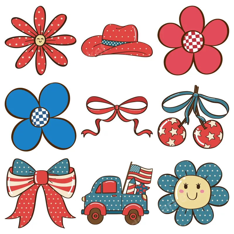 See allThis charming collection of retro patriotic DTF transfers features a delightful array of Americana-inspired designs, perfect for adding a touch of vintage flair to your garments. You'll find cute smiley flowers adorned with stars, a stylish cowboy hat, playful patriotic bows, star-spangled cherries, and an adorable vintage truck proudly flying the American flag. Each element is a high-quality, ready to press direct to film transfer, ensuring vibrant colors and crisp details for your DIY projects or small business needs. These versatile designs are ideal for anyone looking to celebrate patriotic holidays, country events, or simply express their love for Americana style. Whether you're preparing for the 4th of July, Memorial Day, Labor Day, a summer BBQ, or a country music concert, these iron on transfers are a fantastic choice. They also make thoughtful gifts for crafters, vintage enthusiasts, or anyone who enjoys unique, custom apparel. Applying these heat press transfers is straightforward. They work beautifully on a wide range of fabrics including cotton, polyester, and blends. Simply use a heat press at 300-325°F for 15 seconds with medium pressure, then allow to cool completely before peeling. For home users, a household iron can also be used with care. The best part? There’s absolutely no weeding required, saving you time and effort. Crafted from professional-grade DTF film, these apparel transfers boast exceptional durability. They are vibrant, crack-resistant, and incredibly soft to the touch, ensuring your finished products look and feel premium. Elevate your wardrobe or product line with these eye-catching and easy-to-use heat press designs, guaranteed to make a statement.