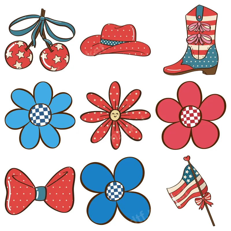 See allImmerse yourself in a wave of vibrant nostalgia with our Retro Patriotic Americana Icons DTF transfer. This playful collection features classic red, white, and blue elements, including charming cherries, a star-spangled cowboy hat, a western boot adorned with flags, cheerful flowers with checkerboard centers, and a waving American flag. Each design brings a delightful, vintage feel to your apparel, making it a perfect ready to press transfer for expressing your patriotic spirit with a touch of retro flair. This versatile direct to film transfer is ideal for anyone celebrating national holidays or simply loving Americana style. Perfect for 4th of July, Memorial Day, Labor Day, or any summer gathering, these designs make fantastic custom transfers for gifts or personal wear. Show your pride at country music concerts, rodeos, or backyard BBQs. Easily create unique shirt designs that stand out and capture a whimsical, patriotic vibe with this iron on decal. Applying this premium heat press transfer is incredibly simple. Designed for a wide range of materials, it adheres beautifully to cotton, polyester, and most fabric blends. For best results, use a heat press at 300-325°F for 15 seconds with medium pressure, then perform a warm peel. A household iron can also be used with careful application. Forget about weeding; these heat press ready transfers mean you’ll have a professional-looking garment in minutes, making custom apparel accessible to everyone. Experience superior quality with every heat press design. Our DTF transfers boast incredibly vibrant colors that pop, exceptional durability with crack-resistant properties, and a wonderfully soft hand feel. Made with professional-grade DTF film and strong adhesive, these apparel transfers ensure a long-lasting, high-quality finish on all your projects. Elevate your wardrobe with a durable and eye-catching iron on transfer that will look fantastic wash after wash.