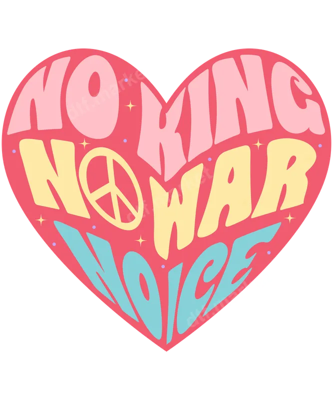 See allEmbrace a message of peace and unity with this eye-catching 'No King No War No Noise' DTF transfer. Featuring a vibrant retro heart design, the text is rendered in playful, wavy fonts with a classic peace symbol replacing the 'O' in 'War'. The color palette of soft pink, cheerful yellow, and serene blue against a warm coral background evokes a nostalgic 70s vibe, making this direct to film transfer a perfect statement piece. It’s a ready to press design that brings positive energy to any garment. This unique heat press transfer is ideal for anyone who believes in a world without conflict. It appeals to peace activists, vintage style lovers, and those who appreciate meaningful messages. Perfect for personalizing your wardrobe for music festivals, peace gatherings, or simply making a statement in your daily life. It also makes an excellent gift for friends or family who share a passion for peace and retro aesthetics. Transform plain apparel into a canvas for change with this impactful iron on transfer. Applying this DTF apparel transfer is incredibly simple, whether you're a seasoned crafter or a beginner. It adheres beautifully to a wide range of fabrics, including cotton, polyester, and various blends. For best results, use a heat press at 300-325°F for 15 seconds with medium pressure, followed by a cool peel. A household iron can also be used with careful application. Unlike vinyl, this heat press design requires no weeding, saving you time and effort for a professional finish on your t-shirts and other garments. You can count on the exceptional quality of our DTF transfers. Each shirt design is printed using premium inks and professional-grade DTF film, ensuring vivid colors that pop and sharp details that last. The transfers are designed to be incredibly durable, crack-resistant, and have a soft, lightweight feel once applied, integrating seamlessly with your fabric. Enjoy a long-lasting, high-quality heat press ready design that maintains its integrity wash after wash.