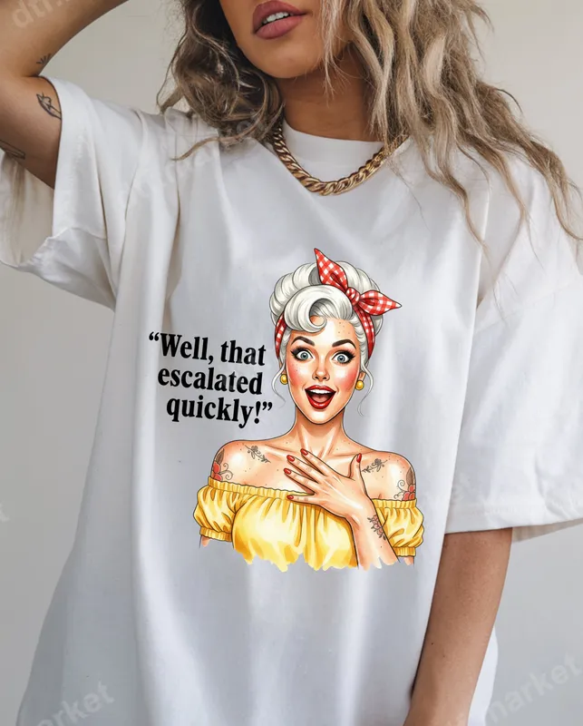 See allBring some retro sass to your wardrobe with this vibrant 'Well, that escalated quickly!' DTF transfer. Featuring a classic pin-up style woman with a shocked yet playful expression, complete with a red gingham headband and yellow off-the-shoulder top, this design is sure to turn heads. The bold typography perfectly complements the character's reaction, making it an instantly recognizable and humorous graphic. This direct to film transfer is ready to press, ensuring a quick and easy application process for your next creative project. This humorous heat press design is ideal for anyone who loves vintage aesthetics, sarcastic humor, or popular internet memes. Perfect for personalizing t-shirts, sweatshirts, tote bags, or even jackets, it makes a fantastic gift for friends, family, or yourself. Wear it to casual gatherings, parties, or simply to add a touch of personality to your everyday attire and spark conversations. Our premium heat press transfers are designed for effortless application on a wide range of materials, including cotton, polyester, and various fabric blends. For best results, use a heat press at 300-325°F for 15 seconds with medium pressure, then cold peel the film. While a heat press is recommended for optimal durability, this iron on transfer can also be applied with a household iron. Enjoy the convenience of a ready to press transfer with no weeding or layering required. Experience superior quality with our durable DTF transfers. Each apparel transfer boasts incredibly vibrant colors that pop, along with excellent wash durability. Our professional direct to film transfers are crack-resistant and offer a soft, smooth feel on any garment, ensuring maximum comfort. The strong adhesive ensures a long-lasting finish, making your custom transfer look great wear after wear. Elevate your apparel with a professional-grade shirt design that stands the test of time.