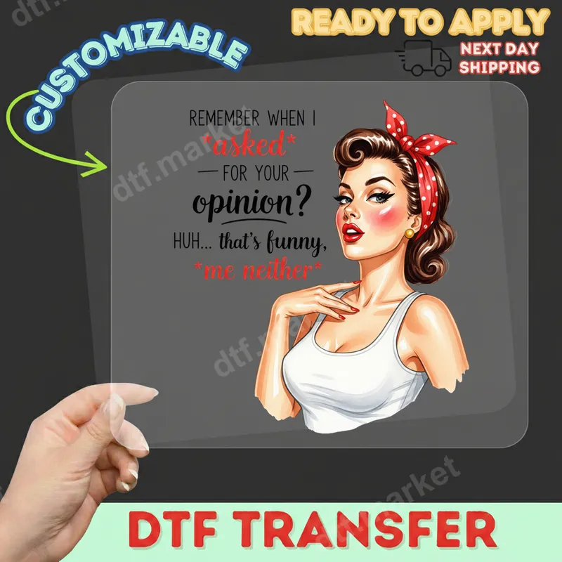 See allEmbrace your bold and sassy side with this striking DTF transfer featuring a classic pin-up style woman adorned with a vibrant red polka-dot bandana. The design is perfectly complemented by the witty, sarcastic quote: 'Remember when I asked — for your — opinion? Huh... that's funny, *me neither*.' This high-quality, ready to press DTF transfer captures a confident, retro vibe, making a statement without saying a word. It’s an instant classic for anyone who loves vintage aesthetics mixed with modern attitude. This unique design is ideal for anyone who loves to express their independent and humorous spirit. It makes a fantastic gift for friends with a sassy sense of humor, empowering women, or anyone who appreciates vintage pin-up art. Perfect for casual wear, ladies' nights out, bachelorette parties, or simply adding a touch of bold personality to your everyday wardrobe. This iron on transfer will surely spark conversations and smiles. Applying this direct to film transfer is incredibly easy and requires no weeding. Our heat press ready designs work flawlessly on a wide range of materials, including cotton, polyester, and various fabric blends. For best results, use a heat press at 300-325°F for 15 seconds with medium pressure, then cold peel. You can also achieve great results with a household iron (firm, even pressure, no steam), making it accessible for everyone to create custom apparel. Experience professional-grade results with our premium apparel transfer. Each DTF transfer is produced with vibrant, high-definition colors that resist cracking and fading, ensuring your design looks fantastic wash after wash. The finished heat transfer offers a soft, smooth feel on your garment, unlike bulky vinyl. Transform your t-shirts, hoodies, bags, and more into personalized fashion statements with durable, high-quality heat press designs.