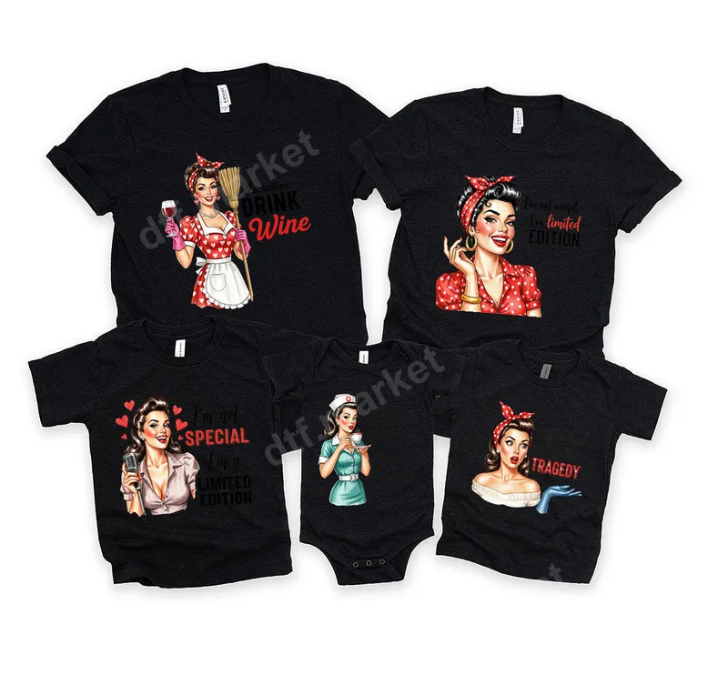 See allStep back in time with our captivating collection of Retro Pin-Up Sassy Attitude DTF Transfers. This unique assortment features classic pin-up girls adorned with witty, empowering, and sometimes cheeky phrases like "I'd rather DRINK Wine" or "I'm not weird, I'm LIMITED EDITION." Each direct to film transfer is designed to bring a touch of vintage charm and modern sass to your wardrobe, making it the perfect ready to press design for anyone with a bold personality. These limited edition designs are ideal for women who love retro aesthetics, sarcastic humor, and expressing their individuality. They make fantastic gifts for friends, moms, or anyone celebrating a birthday, girls' night out, or simply looking to add a unique flair to their everyday apparel. From the confident stare to the playful pose, each transfer captures a different facet of the sassy pin-up spirit. Applying these ready to press transfers is straightforward, whether you use a professional heat press or a household iron. They adhere beautifully to cotton, polyester, and various fabric blends. For best results, use a heat press at 300-325°F for 15 seconds with medium pressure, followed by a cold peel. No weeding or intricate layering required, just press and enjoy your new custom garment. Crafted using high-quality DTF film and vibrant, durable inks, these heat transfers are designed to last. They offer excellent washability, crack-resistant flexibility, and a soft-to-touch finish that feels like part of the fabric. Elevate your custom t-shirt transfer projects with these eye-catching and long-lasting designs, ensuring your unique style shines through with every wear.