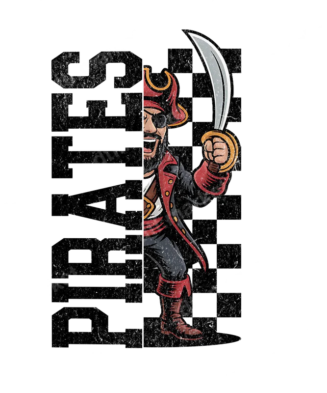 Retro Pirate DTF Transfer | Distressed Swashbuckler Design with Checkerboard