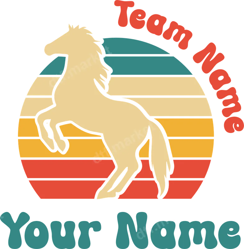 See allThis vibrant DTF transfer captures a majestic rearing horse silhouette against a stunning retro sunset backdrop, featuring warm stripes of teal, cream, orange, and red. The design includes placeholder text for "Team Name" arched above the horse and "Your Name" below, rendered in a charming vintage bubble font, making it perfect for personalization. This high-quality direct to film transfer arrives ready to press, allowing you to create custom apparel with ease and style. Ideal for equestrian enthusiasts, horse riding teams, rodeo participants, or anyone who loves western and vintage aesthetics. This versatile design makes a fantastic addition to team uniforms, club merchandise, or personalized gifts for birthdays, holidays, or horse shows. It’s also a great choice for small businesses looking to add unique, eye-catching ready to press designs to their product line for shirts, bags, and more. Our premium heat press transfer works beautifully on a wide range of fabrics, including cotton, polyester, and various blends. For optimal results, apply with a heat press at 300-325°F for 15 seconds with medium pressure, then perform a cold peel. Alternatively, this iron on transfer can be applied with a household iron (follow included instructions). Enjoy a hassle-free application process with no weeding required, making custom apparel production quick and simple. Experience exceptional quality with our professional-grade DTF transfers. Each transfer boasts vibrant colors, superior detail, and a soft, flexible finish that resists cracking and peeling, even after multiple washes. Crafted using durable DTF film and strong adhesive, these apparel transfers ensure your custom garments look fantastic and last a long time. Transform ordinary items into personalized masterpieces with our reliable and beautiful heat transfers.