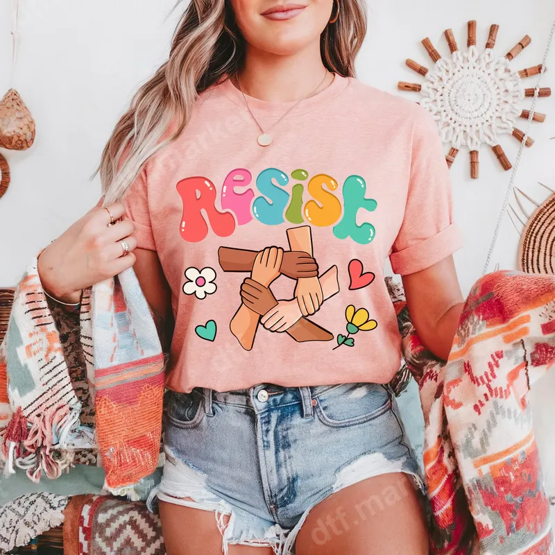 See allMake a powerful statement with our 'Resist' DTF transfer, featuring a vibrant, groovy font that pops with retro charm. This eye-catching direct to film transfer showcases diverse hands intertwined in a symbol of unity and solidarity, surrounded by cheerful hearts and flowers. It’s a bold yet aesthetically pleasing ready to press design perfect for those who advocate for change and connection. Each detailed element ensures your message stands out clearly and stylishly. This unique design is ideal for activists, social justice advocates, or anyone who believes in the power of collective action and positive change. It makes an excellent gift for friends, family, or community members who participate in protests, rallies, or simply want to express their values through their apparel. Perfect for everyday wear, political events, or as a thoughtful present that inspires and empowers, this heat press transfer helps you wear your heart on your sleeve. Applying your new shirt design is simple and hassle-free. Our heat press ready transfers work beautifully on a wide range of materials, including cotton, polyester, and various blends. For professional results, apply with a heat press at 300-325°F for 15 seconds with medium, even pressure. This iron on transfer is also suitable for application with a household iron, making it accessible. Best of all, there's no tedious weeding required – just press and go! Experience exceptional quality with our premium DTF transfers. Each apparel transfer boasts vibrant colors, incredible detail, and a soft, flexible feel that won't crack or peel, even after multiple washes. Crafted using professional DTF film with strong, durable adhesive, these designs are built to last. Easily transform any garment into a personalized statement piece with our high-quality, ready to press transfers.