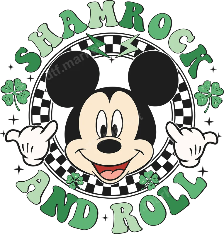 See allThis vibrant "Shamrock And Roll" DTF transfer features a classic cartoon mouse character with a playful St. Patrick's Day twist. The design showcases the iconic character's cheerful face surrounded by shamrocks, lightning bolts, and a retro checkered border. Bold, groovy lettering in shades of green proudly spells out "Shamrock And Roll," capturing a fun, festive, and slightly rebellious vibe. This ready to press transfer is perfect for celebrating the holiday with a touch of beloved character charm. This fun-loving design is ideal for anyone looking to add a whimsical and festive touch to their St. Patrick's Day attire. Perfect for holiday parties, parades, school events, or just everyday wear during March. It makes a fantastic gift for Disney fans, those who love retro styles, or anyone who enjoys celebrating Irish heritage with a unique flair. Create custom shirts for friends, family, or your entire St. Paddy's Day crew. Applying this direct to film transfer is incredibly easy, making garment customization a breeze. It adheres beautifully to a wide range of fabrics, including cotton, polyester, and various blends. For best results, use a heat press at 300-325°F for 15 seconds with medium pressure, followed by a cold peel. A household iron can also be used with care. Enjoy professional-quality results without the hassle of weeding or complex layering. Our premium DTF transfers are known for their exceptional quality and durability. The colors are incredibly vibrant and will not crack, peel, or fade, even after multiple washes. Each iron on transfer features a soft hand feel, ensuring comfort when worn. Crafted with professional-grade DTF film and strong adhesive, these apparel transfers provide a long-lasting, high-definition finish that will make your custom creations stand out.