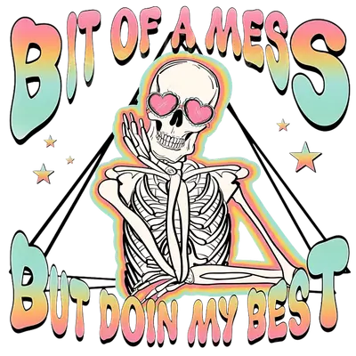 See allThis vibrant DTF transfer features a chill skeleton sporting stylish pink heart-shaped sunglasses, framed by a cool triangular outline. The catchy phrase 'BIT OF A MESS BUT DOIN MY BEST' is boldly displayed in a trendy, gradient font with a retro, bubbly outline, radiating positive yet self-aware vibes. This eye-catching design is ready to press and perfect for adding a touch of quirky personality to any garment. This 'Bit of a Mess' iron on transfer is perfect for anyone who embraces their perfectly imperfect life, from Gen Z trendsetters and college students to busy parents and creative crafters. It's an ideal heat transfer design for personalizing apparel for friends who appreciate humor, making unique birthday gifts, or stocking your small business with popular, relatable inventory. Spread good vibes and self-acceptance with this fun design. Our premium heat press transfer works beautifully on a variety of fabrics including cotton, polyester, cotton-poly blends, and even nylon, ensuring versatility for all your projects. Simply apply with a heat press (300-325°F for 15 seconds with medium pressure) or a household iron. There's no tedious weeding required—just peel and press for instant results! Create custom t-shirts, hoodies, sweatshirts, tote bags, pillow covers, and denim jackets. For lasting durability, wash garments inside out and tumble dry on low heat. Each ready to press transfer boasts vibrant, full-color printing with exceptional fine detail, ensuring your design truly pops. The result is a crack-resistant, soft-to-the-touch finish without the heavy, stiff feel of traditional vinyl. Every direct to film transfer is produced on premium DTF film using a strong adhesive backing, guaranteeing professional-grade results that stand the test of time and wash cycles.