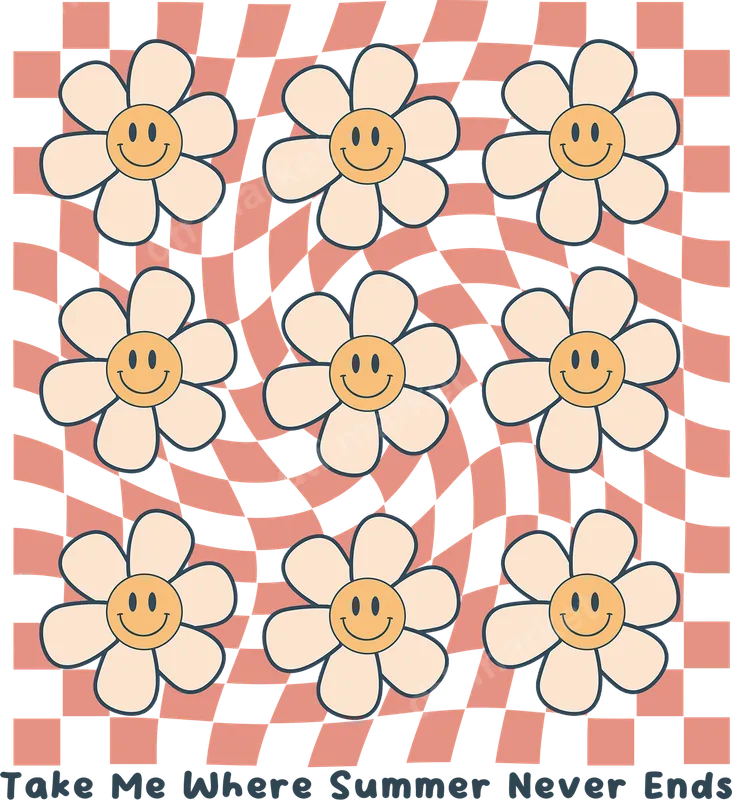 See allThis vibrant DTF transfer captures the essence of eternal summer with a playful arrangement of smiley face daisies set against a wavy, retro checkerboard pattern in peach and white. The cheerful design is complemented by the nostalgic phrase, "Take Me Where Summer Never Ends," rendered in a groovy, rounded font. This direct to film transfer is a ready to press design, perfect for adding a touch of sunshine to any garment or accessory. Ideal for anyone who loves vintage aesthetics, summer vibes, and positive energy, this apparel transfer is perfect for teens, young adults, and anyone longing for warm days. It makes a fantastic gift for birthdays, summer vacations, music festivals, or simply to brighten someone's day. Imagine this iconic heat press design on a custom t-shirt for a beach trip, a school event, or just everyday casual wear. Applying this heat transfer is straightforward and hassle-free. Our high-quality DTF film works seamlessly on a wide variety of materials, including cotton, polyester, and their blends. For best results, use a heat press at 300-325°F for 15 seconds with medium pressure, then perform a cool peel. It can also be applied with a household iron with care. The best part? There's no weeding required, making your customization project quick and easy. Crafted with professional-grade DTF technology, this iron on transfer delivers exceptionally vibrant colors and crisp details that truly pop. The design is engineered to be crack-resistant, ensuring durability and a soft feel against the fabric. Our premium DTF film boasts a strong adhesive, guaranteeing your custom transfer will withstand countless washes and wear, looking great for a long time.