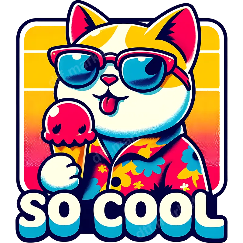 See allThis vibrant DTF transfer features an undeniably "So Cool" cat, rocking stylish blue sunglasses and a bright red Hawaiian shirt adorned with yellow and blue flowers. Holding a scoop of pink ice cream and with its tongue playfully out, this design captures the ultimate summer chill vibe. The retro-inspired color palette and bold lines make this a standout piece, instantly ready to press onto your favorite apparel. Perfect for cat lovers, summer enthusiasts, or anyone who appreciates a touch of retro charm and humor. This ready to press heat transfer is ideal for adding personality to your wardrobe for vacations, beach trips, pool parties, or casual everyday wear. It makes a fantastic gift for friends, family, or even yourself, bringing a smile and a cool attitude to any garment. Applying this versatile iron on transfer is simple. Our high-quality heat press design works flawlessly on a wide range of materials, including cotton, polyester, and various blends. For best results, use a heat press at 300-325°F for 15 seconds with medium pressure. No complicated weeding or layering required; just press and peel. A household iron can also be used with care for smaller applications. Experience superior quality with our professional-grade direct to film transfer. This apparel transfer boasts incredibly vibrant colors that resist cracking and peeling, ensuring your design looks fresh wash after wash. The finished graphic is soft to the touch, providing maximum comfort without a stiff feel. Enjoy durable, long-lasting results that elevate any t-shirt or accessory.