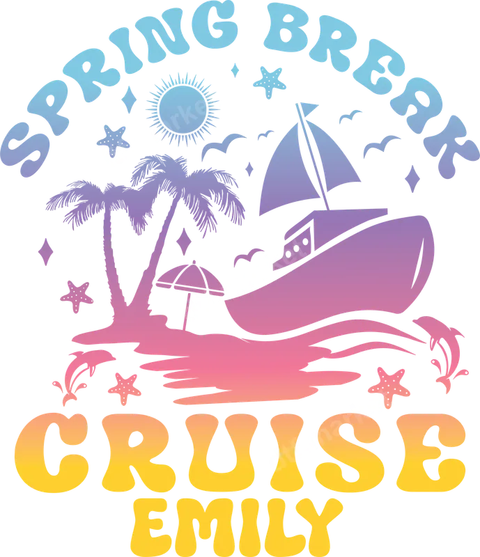 See allDive into your Spring Break adventure with this vibrant 'Spring Break Cruise Emily' DTF transfer! This eye-catching design features a cheerful retro aesthetic, complete with a sparkling sun, majestic palm trees, playful dolphins, and a sleek cruise ship sailing the waves. The beautiful gradient colors evoke a perfect tropical vacation vibe. This high-quality DTF transfer is truly ready to press, allowing you to easily create personalized apparel for your unforgettable trip. This fun, personalized design is ideal for anyone named Emily heading on a Spring Break cruise or seeking a memorable keepsake. It's perfect for creating matching shirts for friends, family, or sorority sisters on a group vacation. Imagine custom t-shirts, tank tops, or beach bags for cruise excursions. It also makes a fantastic, unique gift for a student's trip or a birthday celebration at sea. Applying this direct to film transfer is incredibly simple. It works beautifully on cotton, polyester, and most fabric blends. For best results, use a heat press set to 300-325°F for 15 seconds with medium pressure, then peel cold. You can even use a household iron with firm, even pressure. Forget tedious weeding; our iron on transfer is a hassle-free, ready-to-apply decal for any garment. Experience professional-grade results with our premium apparel transfer. Each heat press design is crafted using durable, high-quality DTF film, ensuring vibrant, long-lasting colors resistant to cracking and fading. The final print boasts a soft, lightweight feel for maximum comfort, without that stiff vinyl feel. Create stunning, personalized garments that look and feel professionally made, celebrating your Spring Break Cruise in style.