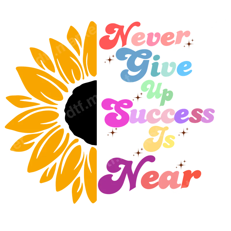 See allInfuse your apparel with a cheerful and inspiring vibe using this vibrant DTF transfer. The design features a charming half sunflower in bright yellow-orange, perfectly paired with the motivational phrase "Never Give Up Success Is Near." The text boasts a groovy, retro-inspired font with each word in a delightful pastel or bright color, accentuated by playful starburst sparkles. This colorful and uplifting design is a ready to press piece, perfect for adding a touch of vintage positivity to any item. This encouraging iron on transfer is ideal for anyone needing a daily dose of motivation, from students heading back to school to entrepreneurs striving for their goals. It makes a thoughtful gift for friends, family, or mentors who appreciate uplifting messages and retro aesthetics. Small business owners and Etsy t-shirt sellers can easily incorporate this heat transfer design into their inventory, creating popular custom apparel for diverse customers, while crafters can personalize items for special events or everyday wear. Applying this heat press transfer is effortless on a wide range of materials including cotton, polyester, cotton-poly blends, and even nylon. Simply use a heat press at 300-325°F for 15 seconds with medium pressure, or apply with a household iron following similar guidelines. There's no tedious weeding required—just peel and press! It's perfect for creating custom t-shirts, cozy hoodies, stylish tote bags, unique denim jackets, inspiring pillow covers, and even baby onesies. For long-lasting durability, wash your finished garment inside out and tumble dry on low heat. Experience professional results with this high-quality ready to press transfer. It features vibrant, full-color printing with exceptional fine detail, ensuring your design truly pops. The transfer is crack-resistant and soft to the touch, avoiding the heavy, stiff feel of traditional vinyl. Each direct to film transfer is printed on premium DTF film with a strong adhesive backing, guaranteeing a seamless and durable application every single time.