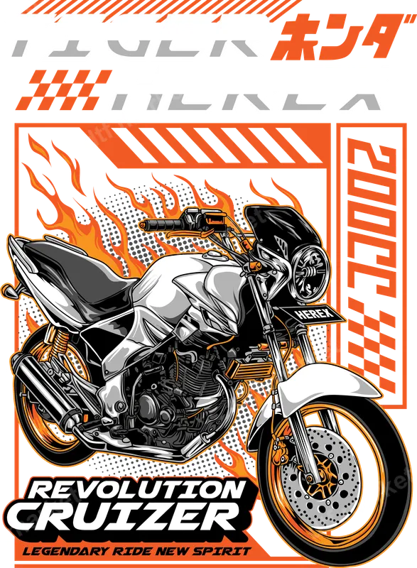 See allThis dynamic DTF transfer features a powerful Revolution Cruizer motorcycle, complete with intricate details and vibrant flames. The design evokes a sense of speed, freedom, and classic biker spirit, showcasing a stylized Honda Tiger 200cc bike with "HEREX" details and a bold "LEGENDARY RIDE NEW SPIRIT" motto. This ready to press design is perfect for those who live life on two wheels and appreciate bold, detailed graphic art. This fierce motorcycle heat transfer is ideal for motorcycle enthusiasts, riders, mechanics, and anyone passionate about custom bikes and racing culture. It makes an excellent gift for birthdays, Father's Day, or any special occasion for the biker in your life. Use this design to personalize apparel for bike rallies, club events, or simply to show off your love for the open road. Applying this apparel transfer is incredibly easy with a heat press. It adheres perfectly to a wide range of materials, including 100% cotton, 100% polyester, and various cotton-poly blends. For best results, press at 300-325°F for 15 seconds with medium, even pressure. Unlike traditional vinyl transfer, our DTF transfers require no weeding, making customization quick and hassle-free. Our premium direct to film transfers boast vibrant colors, exceptional durability, and a soft, flexible feel that resists cracking and fading after multiple washes. Each iron on transfer is printed with high-quality inks on professional-grade DTF film, ensuring a strong, lasting bond to your garments. Experience professional results with every application.