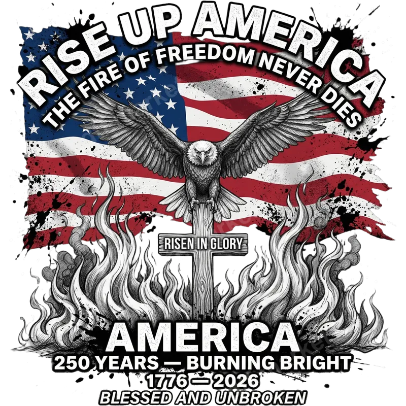 See allThis powerful DTF transfer showcases a bold patriotic theme, commemorating 250 years of American freedom from 1776 to 2026. Featuring a distressed American flag background, a majestic bald eagle perched on a cross, and striking flames, it carries the resonant message: "RISE UP AMERICA, THE FIRE OF FREEDOM NEVER DIES" and "BLESSED AND UNBROKEN." This ready to press design perfectly blends national pride with a spirit of resilience and faith. This design is a perfect heat transfer for patriots, veterans, military families, and anyone who cherishes American freedom and values faith. Ideal for celebrating national holidays like the 4th of July, Memorial Day, or Veterans Day, it also makes a thoughtful gift for history enthusiasts or a powerful statement for everyday wear to express your unwavering American spirit. Applying this apparel transfer is straightforward, whether you're using a professional heat press or an iron on transfer at home. It adheres beautifully to a wide range of materials, including cotton, polyester, and their blends. For best results, press at 300-325°F for 15 seconds with medium pressure. No tedious weeding or layering required; just press, peel, and admire your new custom garment. Our DTF transfers are crafted using professional-grade film and vibrant, durable inks, ensuring a high-quality finish. The design is crack-resistant, soft to the touch, and boasts strong adhesive properties for long-lasting wear. Enjoy a professional-looking shirt design that stands out and proudly displays your message without compromising comfort or washability.
