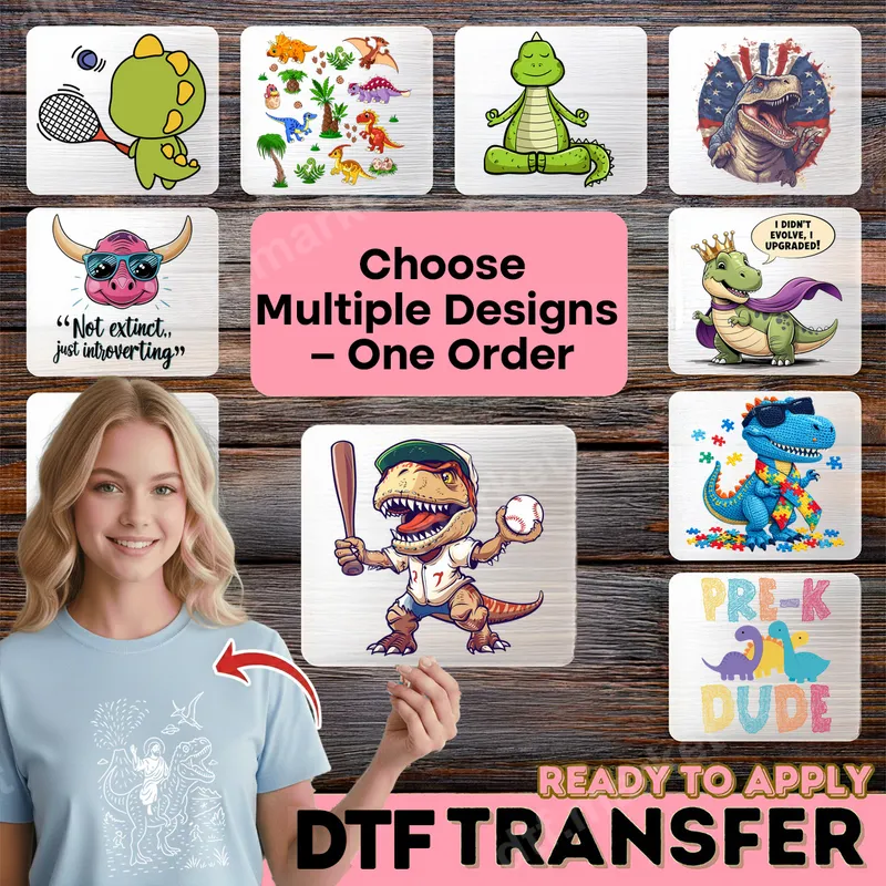 See allStep up to the plate with our fierce yet fun Baseball T-Rex DTF transfer! This vibrant design features a cool Tyrannosaurus Rex in a baseball uniform, complete with bat and ball, ready to hit a home run. Perfect for adding a unique prehistoric twist to your apparel, this high-quality direct to film transfer is ready to press right out of the package, ensuring quick and easy application without any hassle. This awesome dinosaur baseball design is ideal for any fan of America's favorite pastime, dinosaur enthusiasts, or kids who love both! It's a fantastic choice for little league team shirts, game day apparel, birthday gifts, or just to show off a playful spirit. Whether you're heading to the ballpark or a dino-themed party, this ready to press transfer will make a statement. Applying this heat transfer is incredibly simple. It works flawlessly on a wide variety of materials, including cotton, polyester, and their blends. For best results, use a heat press at 300-325°F for 15 seconds with medium pressure, then a warm peel. No heat press? No problem! A household iron can also be used, making it a versatile iron on transfer for any crafter. Enjoy professional results with no weeding required. Crafted with professional-grade DTF film and strong adhesive, this apparel transfer delivers exceptional durability and vivid colors that pop. Our ready to press transfers are designed to be crack-resistant, peel-resistant, and incredibly soft to the touch, ensuring your custom t-shirt transfer looks great wash after wash. Get ready for a high-quality, long-lasting custom design that truly stands out.