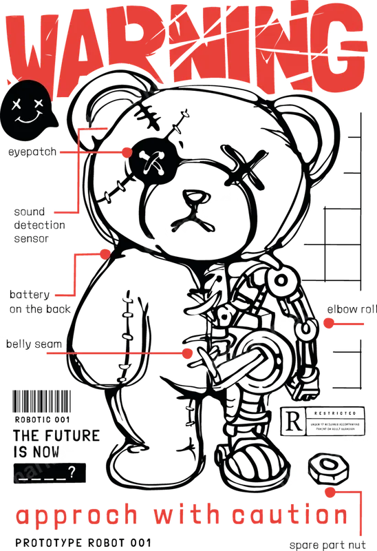 Robotic Teddy Bear DTF Transfer | Warning Caution Sci-Fi Apparel Design