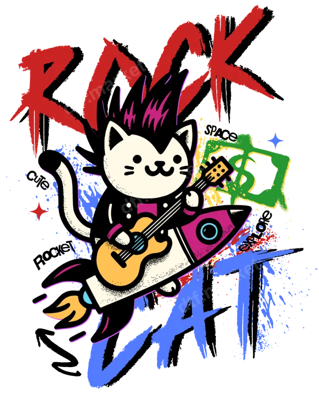 Rock Cat Space Rocket DTF Transfer – Punk Guitar Feline Design