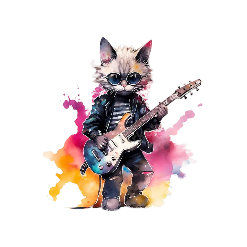 See allThis eye-catching DTF transfer features an undeniably cool cat, complete with stylish sunglasses, an edgy leather jacket, and ripped jeans, confidently strumming an electric guitar. The design bursts with vibrant watercolor splashes in pinks, oranges, and blues, creating a dynamic and artistic rock-n-roll vibe. This high-quality direct to film transfer is ready to press, bringing instant personality to any garment. This unique heat press design is perfect for music enthusiasts, cat lovers, and anyone who appreciates a blend of cute and edgy style. It makes an excellent gift for birthdays, holidays, or just because, for friends and family who love rock music, quirky animals, or stand-out apparel. Ideal for concert-goers, aspiring musicians, or simply adding a fun statement to everyday wear. Applying this heat transfer is incredibly easy, making it suitable for both professional use and DIY projects at home. Our iron on transfers adhere beautifully to a wide range of fabrics, including cotton, polyester, and various blends. For best results, use a heat press at 300-325°F for 15 seconds with medium pressure, then perform a cool peel. A household iron can also be used with careful application. Enjoy a crisp, detailed design without the hassle of weeding. Experience premium quality with every ready to press transfer from dtf.market. Our DTF transfers are renowned for their vibrant colors that truly pop, exceptional durability, and crack-resistant finish, ensuring your heat press ready design looks fantastic wash after wash. The soft-touch feel integrates seamlessly with the fabric, and our professional DTF film utilizes a strong adhesive for a lasting, high-definition result on all your custom apparel.