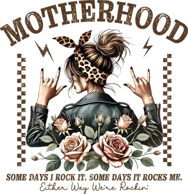 See allUnleash your inner rockstar mom with this edgy 'Rockin' Motherhood' DTF transfer. This vibrant design features a fierce mom sporting a leather jacket, a stylish messy bun with a leopard print bandana, and a classic 'rock on' hand gesture. Adorned with delicate roses and framed by distressed checkerboard, the design proudly declares 'MOTHERHOOD' and the relatable sentiment: 'SOME DAYS I ROCK IT. SOME DAYS IT ROCKS ME. Either Way We're Rockin'.' This ready to press design captures the strength, humor, and untamed spirit of modern motherhood. This 'Rockin' Motherhood' design is perfect for the unapologetically cool mom, biker moms, or anyone who embraces the wild side of parenting. It makes an incredible Mother's Day gift, birthday present for a strong woman, or a fun statement piece for personal wear. Small t-shirt businesses and crafters looking for unique heat transfer designs will find this an irresistible iron on transfer, ideal for creating best-selling apparel or personalized gifts for customers and friends. Applying this heat press transfer is a breeze on cotton, polyester, cotton-poly blends, and even nylon fabrics. For best results, use a heat press at 300-325°F for 15 seconds with medium pressure, or apply with a household iron following similar guidelines. Forget the hassle of weeding; simply peel and press! It's perfect for creating custom t-shirts, cozy hoodies, trendy sweatshirts, versatile tote bags, or even unique denim jackets. For lasting vibrancy, wash garments inside out and tumble dry low. Experience superior quality with this ready to press transfer. It features vibrant, full-color printing that captures every fine detail of the artwork, ensuring your finished product stands out. The transfer is crack-resistant, soft to the touch, and avoids that heavy, stiff vinyl feel. Each direct to film transfer is meticulously printed on premium DTF film with a strong, reliable adhesive backing, guaranteeing professional-grade results that will impress every time.