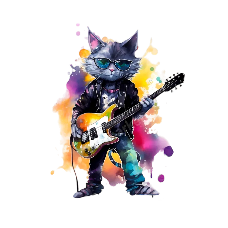 Rockstar Cat DTF Transfer - Guitar Playing Feline in Watercolor Art