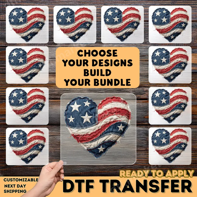See allEmbrace your patriotic spirit with this beautifully distressed American Flag Heart DTF transfer. This unique design features a heart shape crafted from rustic, fabric-textured elements resembling the classic red, white, and blue of the American flag, complete with vintage-style stars. It's a perfect blend of Americana charm and heartfelt pride, making it a standout ready to press graphic for any project. This versatile heat transfer is ideal for anyone looking to showcase their love for the USA. It’s perfect for Fourth of July celebrations, Memorial Day, Veterans Day, or simply as an everyday expression of national pride. Create custom apparel for family events, patriotic parades, or thoughtful gifts for military families and proud Americans. This iron on transfer adds a meaningful touch to any wardrobe or accessory. Applying your American Flag Heart design is incredibly simple. This ready to press transfer works beautifully on a wide range of fabrics including cotton, polyester, and various blends. For professional results, use a heat press at 300-325°F for 15 seconds with medium pressure. It can also be applied with a household iron following our detailed instructions. No weeding or intricate layering required, making customization a breeze. Our premium DTF transfers are known for their exceptional quality and durability. You'll receive a vibrant, crack-resistant design that feels incredibly soft to the touch once applied. Each t-shirt transfer is produced using professional-grade DTF film and inks, ensuring strong adhesive properties and long-lasting wear even after multiple washes. Achieve a professional-looking finish every time.