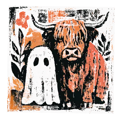 Rustic Highland Cow & Ghost DTF Transfer | Whimsical Halloween Ready to Press