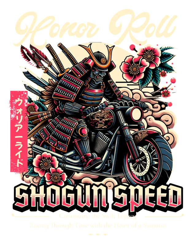 See allThis striking DTF transfer features a fierce samurai warrior, fully armored with katana and arrows, powerfully riding a detailed chopper-style motorcycle. "Honor Roll" is elegantly placed above, while "SHOGUN SPEED" boldly anchors the design below, with "Warrior Ride" in Japanese script on the side. Cherry blossoms and traditional Japanese cloud motifs frame the scene, blending ancient heritage with modern biker coolness. This vibrant, ready to press design is perfect for making a bold statement. Ideal for enthusiasts of Japanese culture, motorcycle riders, or anyone who appreciates unique streetwear and tattoo art aesthetics. This apparel transfer makes an excellent gift for birthdays, Father's Day, or for customizing gear for bike rallies, festivals, and casual wear. Create eye-catching custom shirts or hoodies that stand out from the crowd with this exceptional heat press design. Applying this direct to film transfer is straightforward and efficient. It adheres beautifully to a wide range of fabrics including cotton, polyester, and various blends, making it versatile for almost any garment. Simply use a heat press at 300-325°F for 15 seconds with medium pressure. Unlike traditional vinyl, there's no tedious weeding required, ensuring a smooth, professional finish every time. Crafted with professional-grade DTF film and strong adhesive, this heat press transfer boasts exceptional durability and a soft touch. The colors are incredibly vibrant and engineered to resist cracking, peeling, and fading through countless washes. Elevate your apparel with a high-quality iron on transfer that promises to maintain its striking appearance.