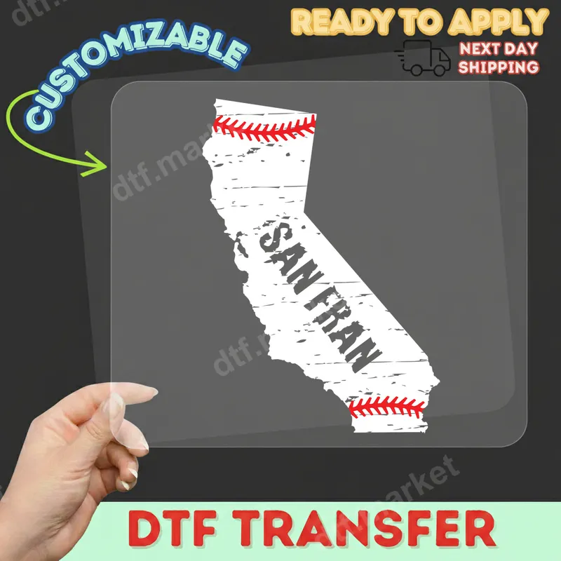 See allThis distressed DTF transfer design proudly features the iconic outline of the state of California, creatively incorporating "SAN FRAN" in a gritty, urban-inspired font across its center. Emphasizing a love for baseball, the top and bottom borders of the state are adorned with classic red baseball stitching, giving it an authentic sporty edge. This eye-catching direct to film transfer is ready to press, allowing you to quickly customize your gear with local pride and team spirit. This unique design is perfect for San Francisco baseball fans, proud Californians, and anyone who loves the intersection of regional pride and America's favorite pastime. It makes an excellent gift for game days, sporting events, birthdays, Father's Day, or simply to show everyday allegiance to the Golden State and its vibrant baseball culture. Create custom fan apparel, spirit wear, or memorable gifts for friends and family. Applying this heat press transfer is a breeze on a wide variety of materials, including cotton, polyester, and most fabric blends. For best results, use a heat press at 300-325°F for 15 seconds with medium pressure, then cool peel. For home crafters, a household iron can also be used with firm, even pressure. Forget tedious weeding; this iron on transfer comes ready for immediate application, saving you time and effort. Experience superior quality with our professional-grade DTF transfers. Each t-shirt transfer delivers exceptionally vibrant colors and crisp details that resist cracking and peeling, even after multiple washes. The innovative film technology ensures a soft, lightweight feel on your garment, providing maximum comfort and durability. Elevate your apparel with a premium, long-lasting print that looks fantastic.