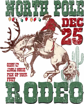 See allUnleash some festive fun with this unique Santa Rodeo DTF transfer, featuring a distressed vintage-style graphic of Santa Claus riding a bucking reindeer like a true cowboy. The design boldly declares "NORTH POLE DEC 25 RODEO" with Christmas lights and a playful "GIDDY UP JINGLE HORSE PICK UP YOUR FEET" slogan, all in a rustic, textured font. This ready to press transfer brings a humorous country-western twist to your holiday apparel, blending the spirit of Christmas with the thrill of the rodeo. This one-of-a-kind iron on transfer is perfect for anyone who loves Western culture, country music, or simply enjoys a good laugh during the holidays. It's an ideal choice for Christmas parties, family gatherings with a twist, or as a thoughtful and funny gift for rodeo enthusiasts and cowboys/cowgirls. Small apparel businesses, Etsy sellers, and crafters looking for distinctive heat transfer designs to offer their customers will find this a fantastic addition to their holiday collection. Applying this heat press transfer is simple and efficient. It works seamlessly on a wide range of fabrics including cotton, polyester, and blends, and even nylon, making it incredibly versatile. Just apply with a heat press at 300-325°F for 15 seconds with medium pressure, or use a household iron for smaller projects. There’s no weeding or intricate cutting required – simply peel and press to create custom t-shirts, cozy hoodies, sweatshirts, tote bags, pillow covers, or even unique denim jackets. For best results and lasting durability, wash garments inside out and tumble dry on low heat. Experience professional quality with every ready to press transfer. This direct to film transfer boasts vibrant, full-color printing that captures every fine detail and distressed texture in the design. Our DTF transfers are engineered to be crack-resistant and offer a soft, comfortable feel on any garment, avoiding the heavy, stiff sensation of traditional vinyl. Each design is printed on premium DTF film with a strong adhesive backing, ensuring reliable and stunning results for all your custom apparel projects.