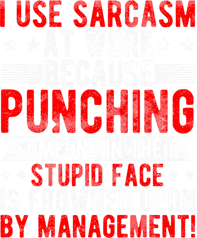 See allThis bold and humorous DTF transfer features the relatable phrase, "I USE SARCASM AT WORK BECAUSE PUNCHING SOMEONE IN THEIR STUPID FACE IS FROWNED UPON BY MANAGEMENT!" The distressed typography in red and white gives it an edgy, worn-in look, perfect for a statement piece. This high-quality direct to film transfer is ready to press onto your favorite apparel, making it incredibly easy to create custom garments. Ideal for anyone with a dry wit, a challenging boss, or just a love for funny work-related memes. This design makes a fantastic gift for coworkers, friends, or family members who appreciate sarcastic humor, especially for birthdays, office secret santa, or just as a fun "thinking of you" present. It's also perfect for team-building events where a bit of lighthearted banter is welcome, or for personalizing your everyday wear to show off your personality. Our premium heat press transfers are designed for effortless application on a wide range of fabrics, including cotton, polyester, and various blends. For best results, use a heat press at 300-325°F for 15 seconds with medium pressure. These iron on decals can also be applied with a household iron, following included instructions. The best part? There's absolutely no weeding or layering required, saving you time and effort. Experience vibrant colors and exceptional durability with every ready to press transfer. Our advanced DTF technology ensures the design is crack-resistant, peel-resistant, and incredibly soft to the touch, feeling like part of the fabric itself. Each t-shirt transfer is produced on professional-grade DTF film with a strong, reliable adhesive, guaranteeing a long-lasting, high-quality finish for all your custom shirt designs.