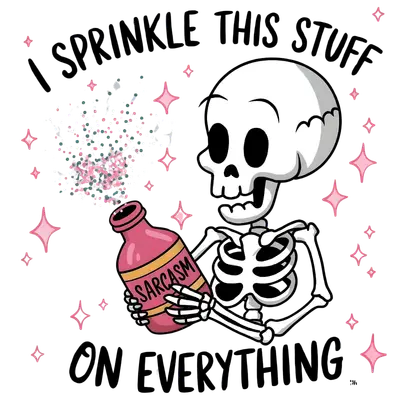 See allUnleash your inner wit with this hilarious 'I Sprinkle This Stuff On Everything' sarcasm skeleton DTF transfer! This playful design features a cheerful cartoon skeleton gleefully shaking a pink bottle labeled 'SARCASM,' scattering colorful glitter and sparkles. It's a vibrant, eye-catching image that perfectly blends cute spookiness with a sassy attitude, making it a fantastic ready to press graphic for anyone who loves a good laugh and isn't afraid to show their sarcastic side. This unique iron on transfer is perfect for those with a great sense of humor, including sarcastic teens, witty adults, and anyone who appreciates a touch of irreverent fun. It makes an excellent gift for friends, family, or even yourself, ideal for birthdays, Halloween parties, or just everyday wear. Small t-shirt businesses, Etsy sellers, and crafters looking for popular heat transfer designs will find this a fantastic addition to their product line, offering a unique graphic that resonates with a broad, fun-loving audience. Applying this heat press transfer is a breeze! It adheres beautifully to a wide range of materials, including cotton, polyester, cotton-poly blends, and even nylon. For best results, use a heat press at 300-325°F for 15 seconds with medium pressure, or apply with a household iron. There's no weeding required – simply peel and press for instant results. Use it to create awesome custom t-shirts, hoodies, sweatshirts, tote bags, pillow covers, and even denim jackets. Remember to wash inside out and tumble dry low for lasting durability. Experience professional-grade quality with this ready to press transfer. It boasts vibrant, full-color printing with exceptional detail, ensuring your design looks crisp and lively. The print is crack-resistant and incredibly soft to the touch, avoiding that heavy, stiff vinyl feel. Each direct to film transfer is produced on premium DTF film with a strong, reliable adhesive backing, guaranteeing a smooth application and professional-looking results every time you create apparel or accessories.