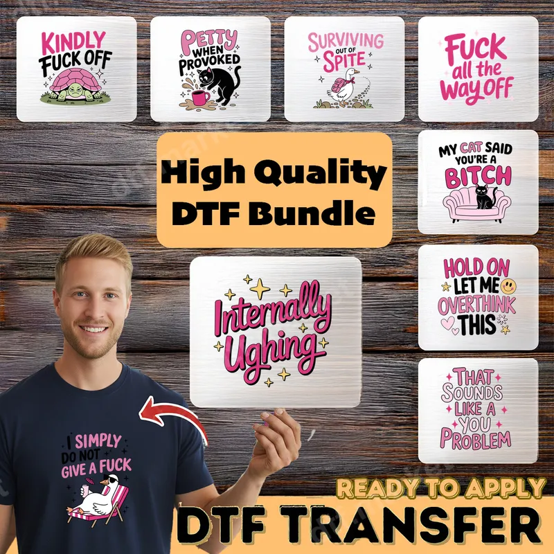 See allThis exclusive DTF transfer bundle features eight hilariously bold and sarcastic designs, perfect for expressing your unfiltered personality. Each ready to press graphic combines witty phrases like "Kindly Fuck Off" and "Internally Ughing" with grumpy animals such as a turtle, a petty cat, and a "I Simply Do Not Give A Fuck" duck. With vibrant colors and sharp details, these direct to film transfers bring a unique blend of sass and humor to any garment. These heat press transfers are ideal for anyone who loves dark humor, sarcasm, or an unapologetic attitude. Perfect for personalizing apparel for casual wear, social gatherings, or as a hilariously relatable gift. Whether you're feeling petty, overthinking, or simply surviving out of spite, there's a design here to match your mood. Our versatile iron on transfers are designed for easy application on various fabrics, including cotton, polyester, and blends. Achieve professional results using a heat press at 300-325°F for 15 seconds with medium pressure, or apply them smoothly with a household iron. Unlike traditional vinyl transfer options, these apparel transfers require no weeding, saving you time and effort. Crafted from high-quality professional DTF film, these shirt designs boast exceptional durability and a vibrant finish that truly stands out. Enjoy transfers that are crack-resistant, peel-free, and remarkably soft to the touch, ensuring comfort and longevity. Our strong adhesive backing makes these custom transfers a reliable choice for long-lasting, eye-catching apparel.