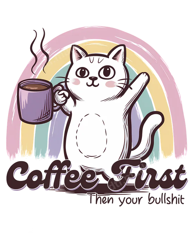 See allWake up and make a statement with our hilarious 'Coffee First, Then Your Bullshit' DTF transfer. This vibrant design features an adorable yet sassy white cat holding a steaming coffee mug, set against a charming pastel rainbow background. It's the perfect ready to press graphic for anyone who knows the importance of caffeine before facing the day. This high-quality direct to film transfer is sure to bring smiles and nods of agreement. Ideal for coffee aficionados, cat lovers, and anyone who appreciates a good dose of adult humor with their morning brew. This witty shirt design makes an excellent gift for friends, coworkers, or family members who aren't quite morning people. Perfect for casual wear, weekend outings, or as a fun addition to your personal wardrobe, it's a unique way to express your personality and boundaries before you've had your first cup. Applying this professional heat transfer is incredibly easy. Our heat press transfers work flawlessly on a wide range of materials, including cotton, polyester, and various blends. For best results, use a heat press at 300-325°F for 15 seconds with medium pressure. It can also be applied with a household iron for smaller projects or personal use, following similar temperature and pressure guidelines. There’s no need for tedious weeding, making customization quick and hassle-free. Experience superior quality with our durable DTF transfers. Each iron on transfer boasts vibrant colors that pop, exceptional wash durability, and resistance to cracking or peeling. The design feels soft to the touch, seamlessly blending with your garment. Crafted with professional-grade DTF film and strong adhesive, this apparel transfer ensures a long-lasting, high-quality finish for all your custom creations.