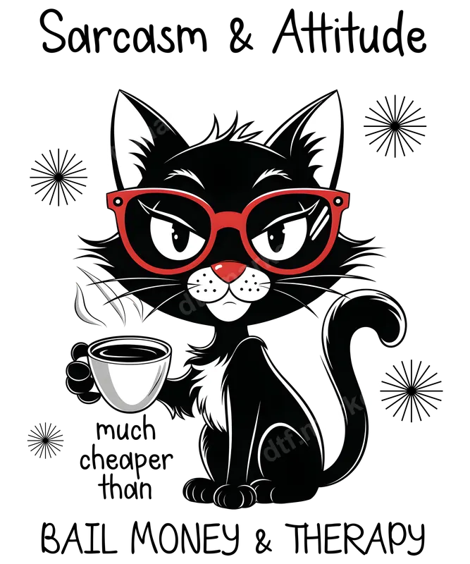 See allThis eye-catching DTF transfer features a charmingly grumpy black cat, sporting stylish red glasses and holding a steaming coffee cup. The design is emblazoned with the witty phrase, "Sarcasm & Attitude much cheaper than BAIL MONEY & THERAPY," capturing a perfectly sassy and relatable mood. This high-quality, ready to press heat transfer is ideal for adding a touch of humor and personality to any garment. Perfect for cat enthusiasts, coffee aficionados, and anyone who appreciates dry humor, this unique design makes an excellent gift for friends, family, or even yourself. It’s ideal for casual wear, quirky events, or simply expressing your bold personality. Whether you're making a statement at home, at work, or out with friends, this shirt design is sure to spark smiles and knowing nods. Applying this apparel transfer is simple and efficient. It works beautifully on a wide range of materials, including cotton, polyester, and various blends. For best results, use a heat press at 300-325°F for 15 seconds with medium pressure. A household iron can also be used for application. Unlike traditional vinyl transfer, our DTF transfers require absolutely no weeding, saving you time and effort. Our professional-grade DTF transfers ensure vibrant colors and crisp details that will stand out. Designed for durability, this iron on transfer is crack-resistant, peel-resistant, and maintains its softness after application, making it comfortable to wear. The strong adhesive ensures a long-lasting finish, allowing your custom transfer to endure countless washes without fading.