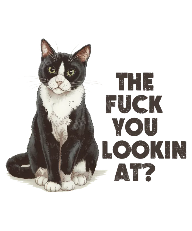 See allThis striking DTF transfer features a charming yet fiercely sarcastic tuxedo cat, seated poised with an unmistakable glare. Accompanied by the bold, distressed text "THE FUCK YOU LOOKIN AT?", this design perfectly captures the sassy, no-nonsense attitude often associated with our feline friends. It's a fantastic ready to press transfer for adding edgy, humorous flair to your wardrobe. Ideal for cat lovers with a bold sense of humor, this heat press transfer makes a great statement piece. Perfect for casual wear, social gatherings, or as a hilariously blunt gift for friends and family who appreciate adult humor and sarcastic remarks. It's an excellent choice for birthdays, white elephant exchanges, or just because. This unique iron on decal is sure to turn heads. Applying this high-quality shirt design is straightforward, making it perfect for both beginners and experienced crafters. Our versatile DTF transfers are designed to work flawlessly on a wide range of materials, including cotton, polyester, and various fabric blends. For best results, use a heat press at 300-325°F for 15 seconds with medium pressure. Unlike vinyl transfers, there's no weeding required. Experience superior print quality with vibrant colors and crisp details that truly stand out. This professional-grade apparel transfer is engineered for durability, offering excellent crack resistance and a soft, smooth feel once applied. Crafted using premium DTF film and strong adhesive, your finished garment will withstand countless washes while maintaining its bold look and professional results.