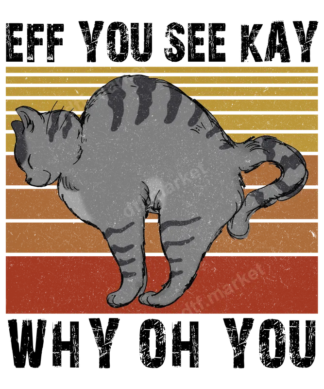 See allUnleash your inner sass with this hilarious 'Eff You See Kay Why Oh You' DTF transfer, featuring a grumpy gray tabby cat with an arched back against a distressed retro striped background of gold, orange, and red. This unique design cleverly spells out a classic phrase, perfect for those who appreciate witty, indirect humor. It's a premium, ready to press heat transfer that will add a bold statement to any garment or accessory. This sarcastic cat design is ideal for cat lovers, humor enthusiasts, and anyone who enjoys a bit of playful defiance. It makes a fantastic gift for friends, family, or even yourself, celebrating birthdays, casual get-togethers, or simply showing off your attitude. Perfect for adding personality to everyday wear or creating memorable custom apparel for events and gatherings. Our high-quality heat press transfer is designed for easy application on a wide range of materials, including cotton, polyester, and their blends. For best results, apply with a heat press at 300-325°F for 15 seconds with medium pressure, then cold peel. No need for tedious weeding, making this iron on transfer incredibly user-friendly for both beginners and experienced crafters. This ready to press design ensures a flawless finish every time. Experience superior print quality with our durable direct to film transfer. Each t-shirt transfer boasts vibrant colors, excellent wash durability, and a soft-to-touch feel that won't crack or peel. Crafted from professional-grade DTF film with strong adhesive, this apparel transfer ensures your design stays looking fresh and fantastic for the long haul. Upgrade your wardrobe with a design that truly lasts.