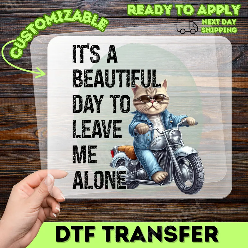 See allThis hilarious DTF transfer features a super cool cat sporting sunglasses and a denim jacket, cruising on a classic motorcycle. The bold text "IT'S A BEAUTIFUL DAY TO LEAVE ME ALONE" perfectly captures a mood many can relate to. This sarcastic and funny design is a fantastic way to express your desire for personal space with a touch of playful attitude. It's a high-quality, ready to press heat transfer that will add character to any garment. This unique design is perfect for introverts, cat lovers, and anyone who appreciates a good dose of dry humor. It makes an excellent iron on transfer for personalizing gifts for friends, family, or even yourself! Ideal for casual wear, weekend outings, or simply lounging at home, it’s sure to get a chuckle. Whether you're gifting it for a birthday or just because, this design speaks volumes without saying a word. Our premium DTF transfer is incredibly versatile, designed to adhere flawlessly to a wide range of fabrics including cotton, polyester, and various blends. Application is a breeze – simply use a heat press at 300-325°F for 15 seconds with medium pressure, or apply with a household iron. Unlike traditional vinyl, there's no weeding required, making your custom apparel transfer projects quick and easy. Enjoy professional results every time you press this t-shirt transfer onto your chosen item. Crafted with professional-grade DTF film and strong adhesive, this heat press design boasts vibrant colors and exceptional durability. The print is crack-resistant, peel-resistant, and incredibly soft to the touch, ensuring comfort and longevity for your custom apparel. You'll love the smooth finish and professional look this design brings to any item.